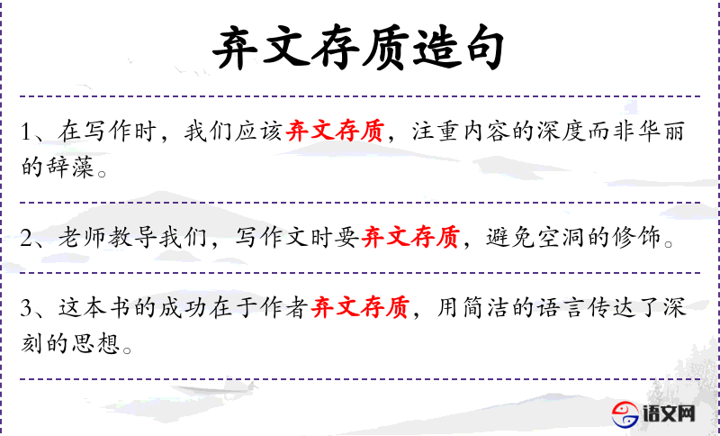 - 弃文存质:放弃表面的华丽文辞,保留实质内容。