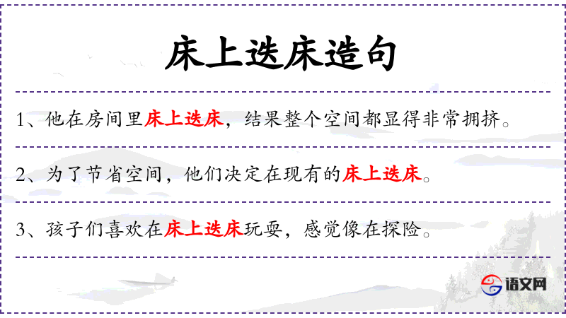 - 床上迭床:名词短语,指在床上堆放过多的床单、被褥等。