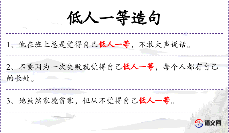 - 低人一等:短语,表示地位或价值低于他人。