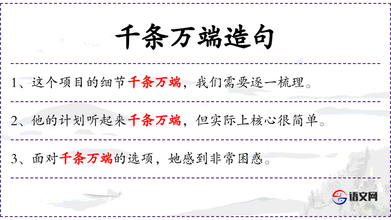 - 千条万端:形容词短语,形容情节复杂多样。
