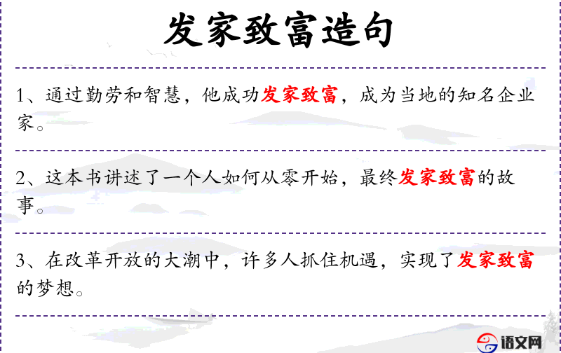 - 发家致富:指通过努力工作或创业变得富有。