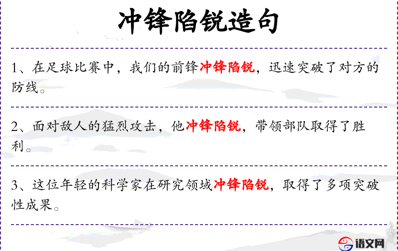 - 谓语:冲锋陷锐,迅速突破了