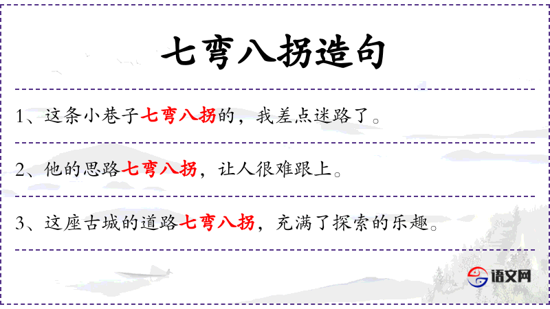 句子:“这条河的流向七弯八拐,形成了许多美丽的河湾。”