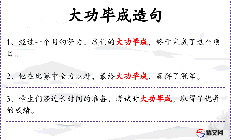 句子中的“大功毕成”是一个成语,源自传统文化,意味着完成了一项重大的任务。这个成语强调了努力和坚持的重要性,与文化中推崇的勤奋和毅力相契合。