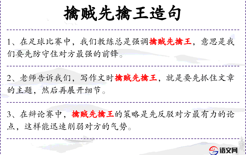 - 擒贼先擒王:这是一个成语,意思是解决问题时要先解决最关键的部分。