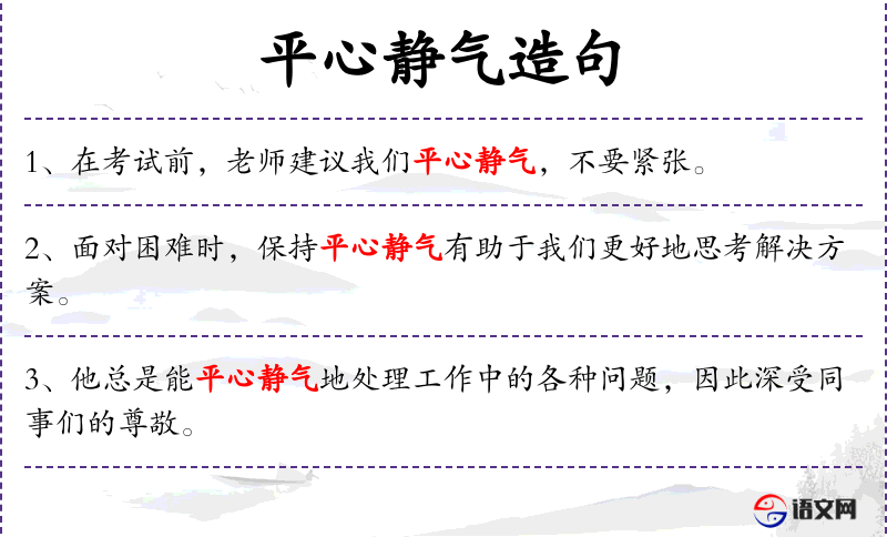 - 平心静气:形容词短语,意为冷静、不冲动。