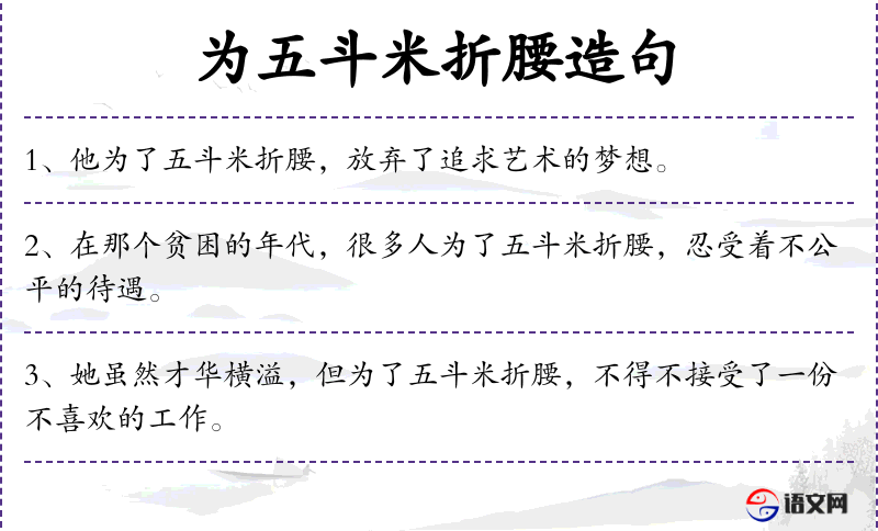 - 状语:在金钱的诱惑下,为了五斗米折腰
