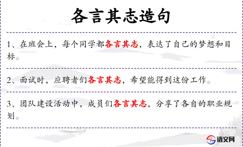 1. 【各言其志】 各自表明自己的愿望和志向。