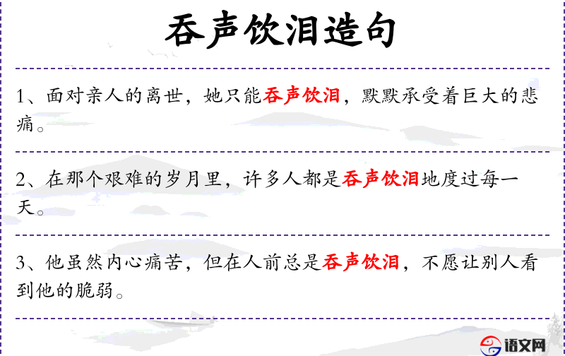 - 礼貌用语:这里的“吞声饮泪”可以被视为一种礼貌的表达,因为它避免了直接展示脆弱,保持了一定的社交距离。