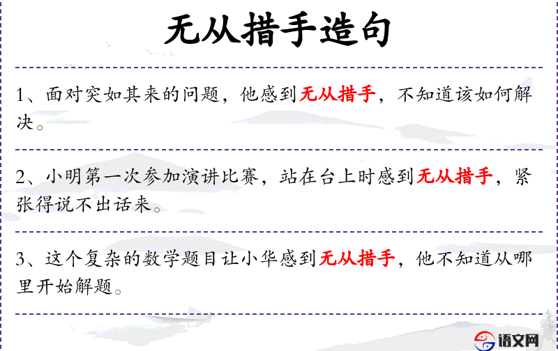 1. 【无从措手】 无从:没有门径或难以理出头绪;措:安置;措手:着手。指事物头绪杂乱,无法着手处理。