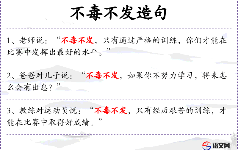 - 不毒不发:这是一个成语,意思是如果不经历艰难困苦,就不会有显著的成就。