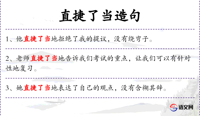 2. 【直捷了当】 - 形容说话、做事不绕弯子,干脆爽快。同“直截了当”。