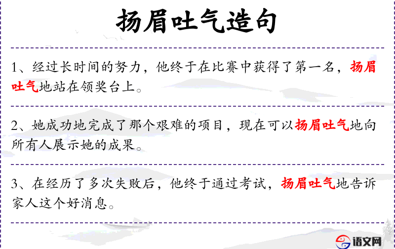 - 扬眉吐气:成语,形容得意或自豪的样子。