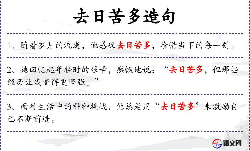 - 去日苦多:成语,意思是过去的岁月充满了苦难。