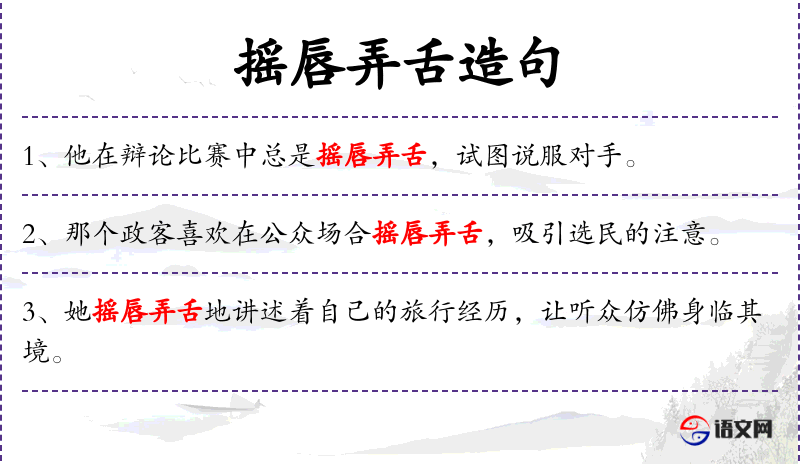 - 摇唇弄舌:成语,形容说话巧妙、能言善辩。