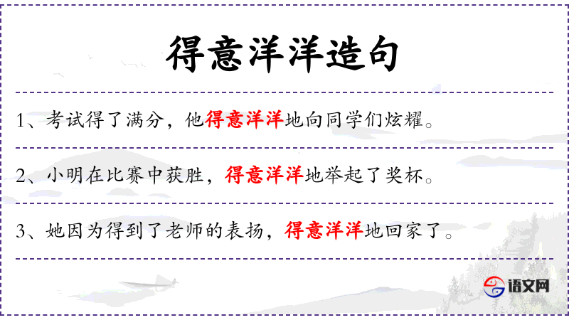 - 得意洋洋:副词短语,形容非常得意的样子。