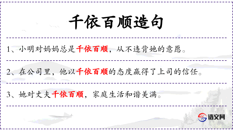 - 千依百顺地:副词,形容非常顺从,没有任何异议。