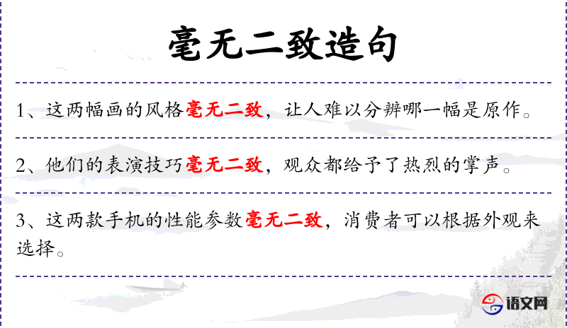 1. 【毫无二致】 - 二致:两样。丝毫没有什么两样。指完全一样。