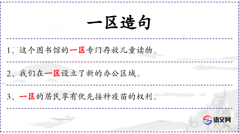 1. 【一区】 - 一个区域; 表数量。指一块田地; 表数量。指一所宅院; 一类;一团。