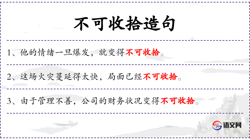 - 不可收拾:形容局面或情况变得无法控制或解决。