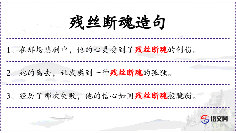 4. 【残丝断魂】 - 残:剩余的;丝:蚕和其它昆虫吐的丝;断:断绝;魂:魂魄。比喻即将死亡的生命。