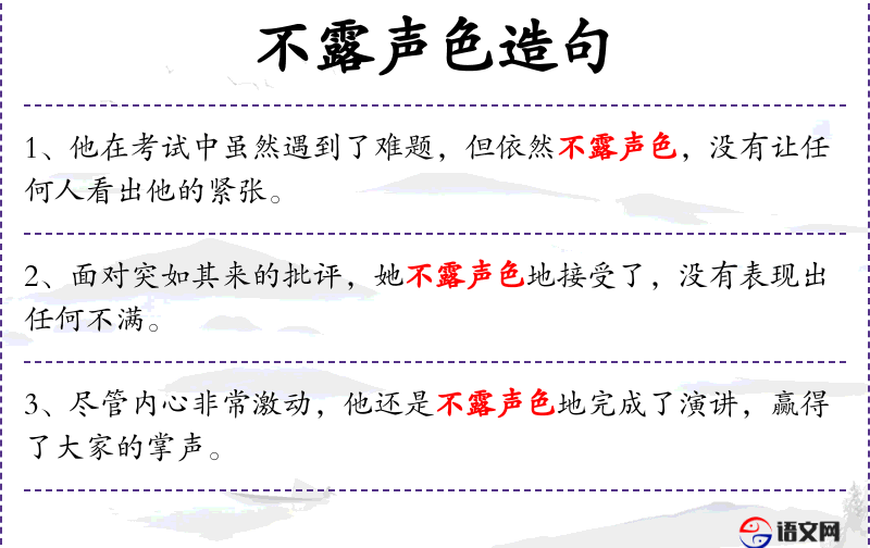 1. 【不露声色】 - 声:说话的声音;色:脸上的表情。心里的打算不在说话和脸色上显露出来。