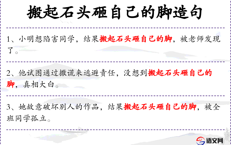 - 宾语:别人的作品、石头、自己的脚、全班同学