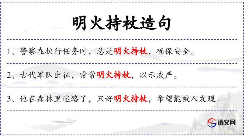 - 明火持杖:动词短语,表示点燃火把并拿着手杖,可能用于照明和支撑。