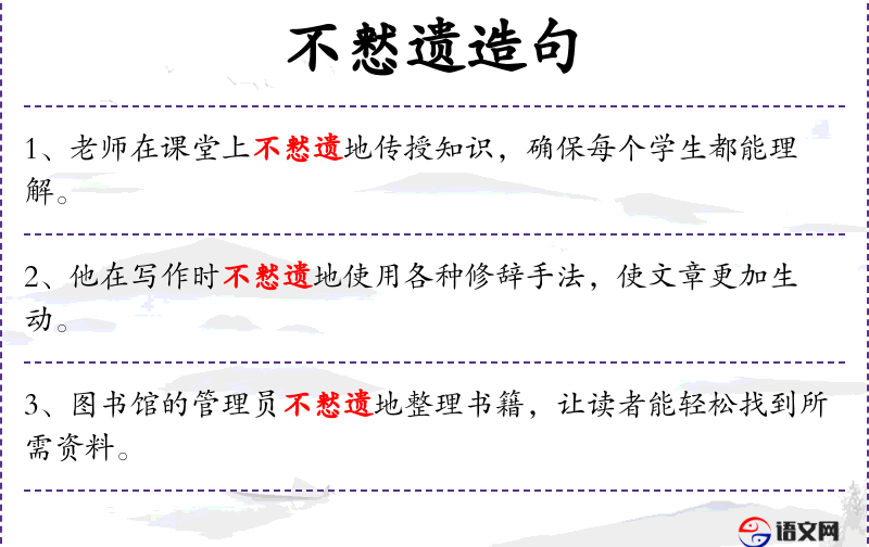 1. 【不慭遗】 - 不愿留。《诗.小雅.十月之交》"不慭遗一老,俾守我王。"后用作对大臣逝世表示哀悼之辞。
