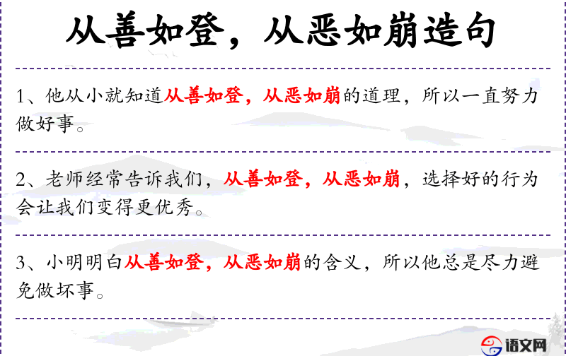 - 从善如登:比喻做好事就像攀登山峰一样,需要努力和坚持。