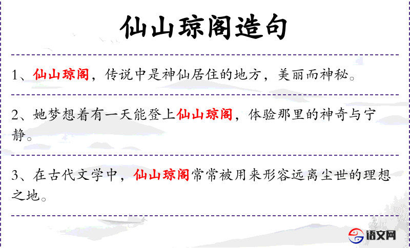 - 仙山琼阁:比喻美丽如仙境的建筑。
