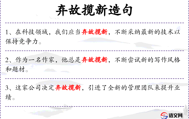 - 弃故揽新:成语,意为放弃旧的,接受新的。