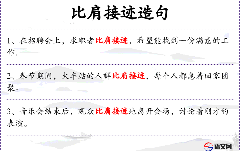 3. 【比肩接迹】 肩膀相靠,足迹相接。形容人多或接连不断。
