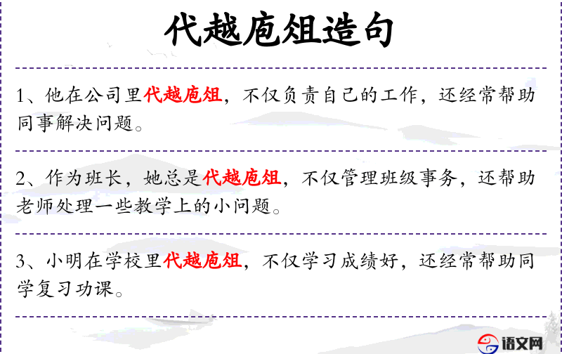 - 代越庖俎:这个成语源自《左传·僖公二十五年》,原意是指超越自己的职责去处理别人的事务。在现代语境中,它常用来形容某人超越职责范围,承担更多责任。