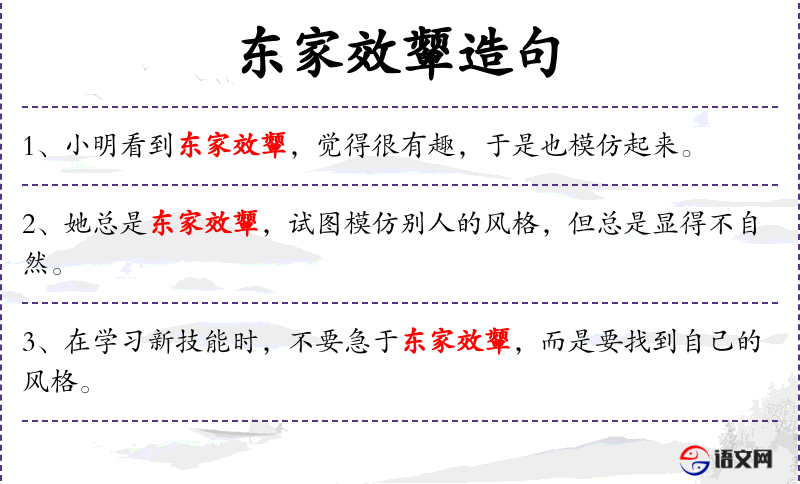 “东家效颦”是一个成语,源自古代的一个故事,意为模仿别人的行为。这个成语反映了人对于模仿行为的看法,可能包含一定的文化意义,如对于模仿的接受度或评价。