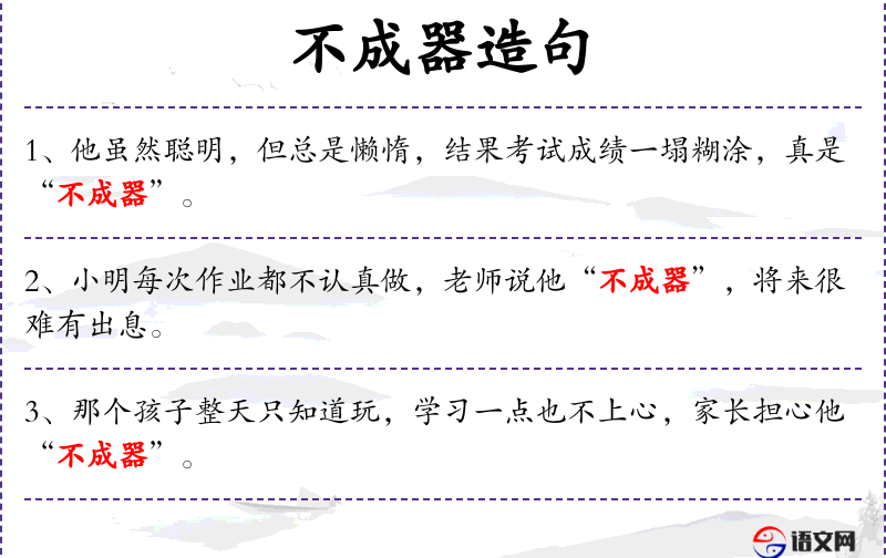 2. 【不成器】 器:指人的度量、才干。不能成为有用的器物。多用以指人气质平庸,不能有所成就,没有什么出息。有时也指不学好,自甘堕落。