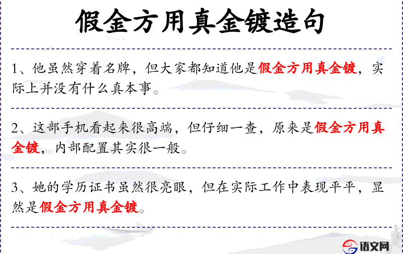 - 成语:“假金方用真金镀”是**传统文化中的成语,用来形容外表华丽但内在空虚。