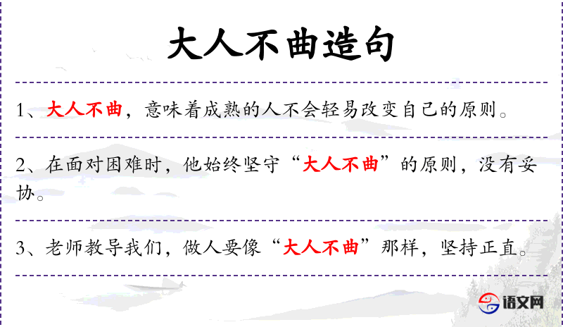 句子:“[老师教导我们,做人要像“大人不曲”那样,坚持正直。]”