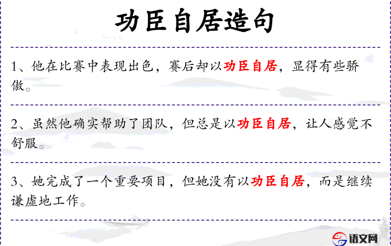 - 宾语:(无具体宾语,但“表现出色”和“以功臣自居”是两个并列的谓语结构)