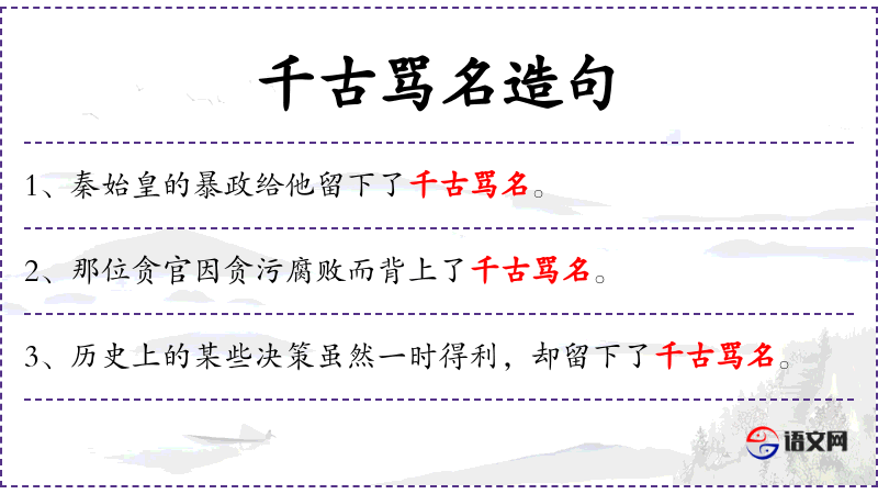 - 千古骂名:指长期、甚至永远被人们所唾弃的名声,千古表示时间的长远,骂名表示负面评价。