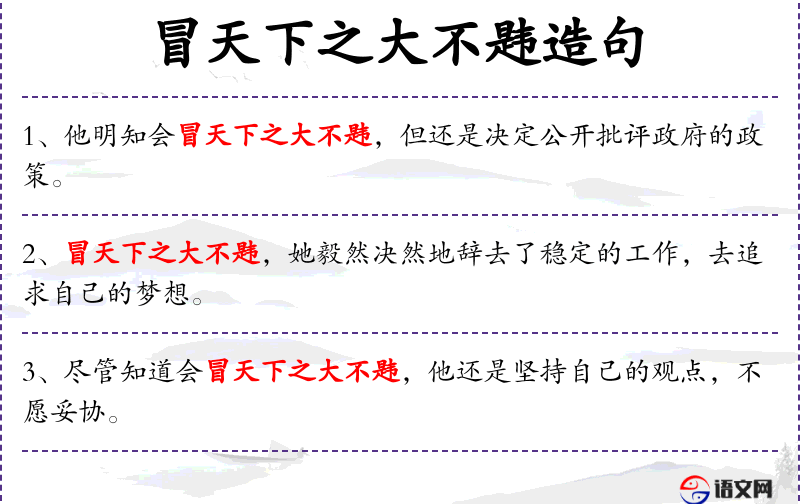 - 冒天下之大不韪:这是一个成语,意思是做违背大多数人意愿或传统观念的事情,承担巨大的风险或批评。