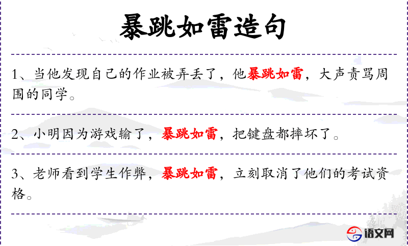3. 【暴跳如雷】 - 暴:暴烈,急躁。急怒叫跳,象打雷一样猛烈。形容又急又怒,大发脾气的样子。