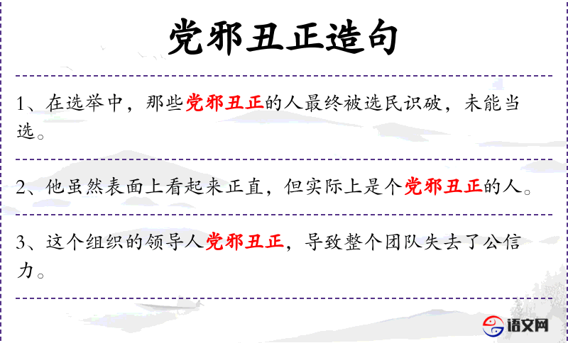- 党邪丑正:指政治团体中的不正当行为或腐败现象。