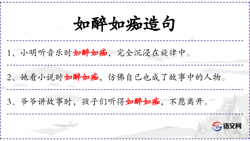 - 相关成语:如醉如痴可以与“陶醉”、“沉迷”等词汇联系起来。
