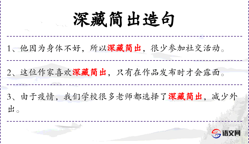 5. 【深藏简出】 简:简省。原指野兽藏在深密的地方,很少出现。后指常呆在家里,很少出门。