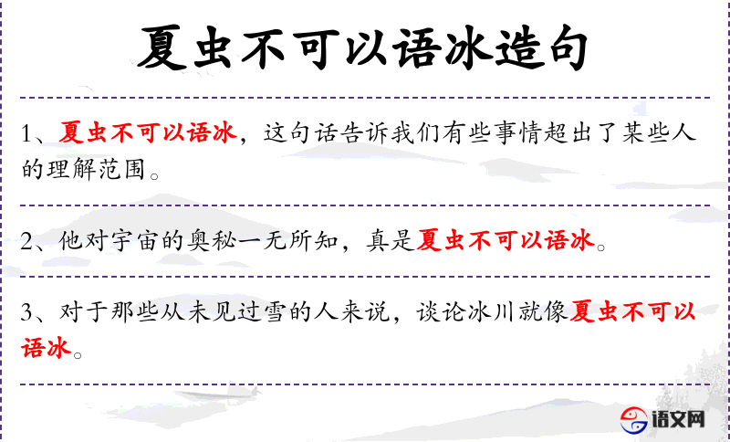 句子中的“夏虫不可以语冰”是一个成语,源自《庄子·秋水》。这个成语反映了人对于知识和理解的重视,以及对于无知状态的批评。
