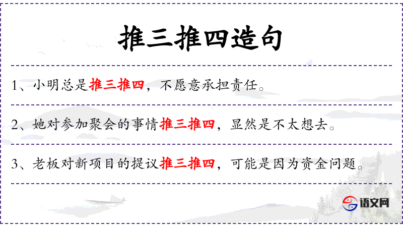 - 推三推四:形容人推脱、犹豫不决的态度。