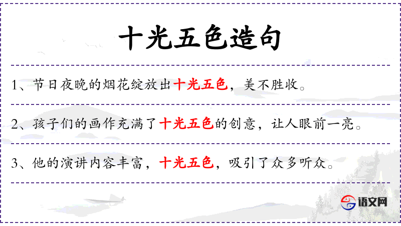 - 十光五色:形容色彩丰富、绚丽多彩。