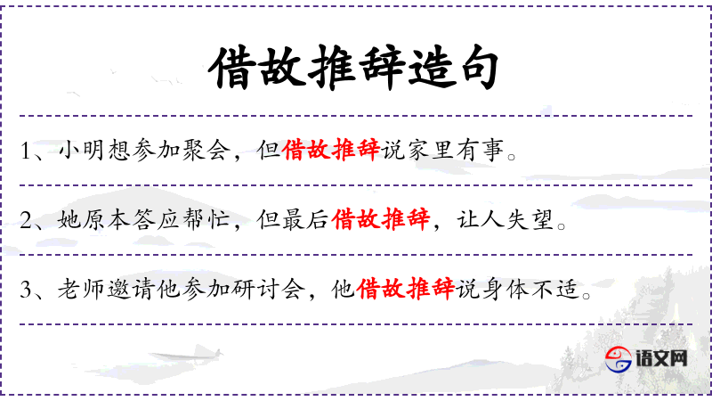 - 礼貌用语:虽然“借故推辞”可能听起来不太礼貌,但在这种情况下,它可能被视为一种委婉的拒绝方式。
