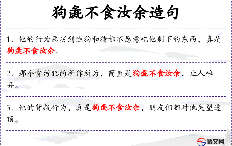1. 【狗彘不食汝余】 - 食:吃。狗猪都不吃他剩下的东西。形容人的品行极其卑鄙龌龊。